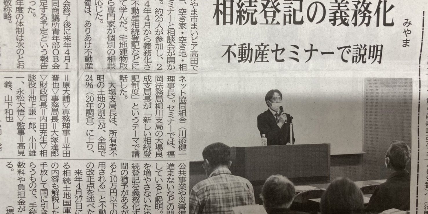 セミナーでは、福岡法務局柳川市局の大場良成支局長が「新しい相続登記制度」というテーマで講話した。
