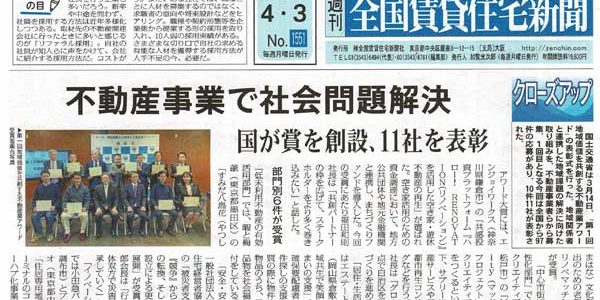 2023年3月、RYハウジングが加盟している、ありあけ不動産ネット協同組合が国土交通省主催の不動産業アワード特別賞受賞にともない、全国賃貸住宅新聞より当組合に取材があり、その内容が業界新聞に掲載されました。