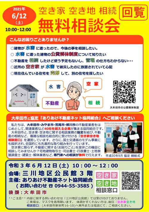 新型コロナウィルス感染症緊急事態宣言により6月12日日開催予定でしたが7月3日に予定変更されました。 令和2年7月大牟田市豪雨により損壊した家屋等の解体・撤去にかかった費用について「費用償還」の相談会を7月3日大牟田市三…