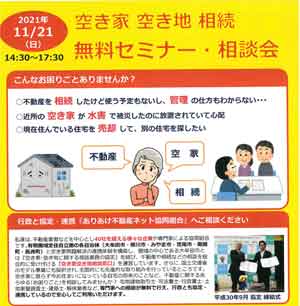 「不動産を相続したけど使う予定もないし、管理の仕方もわからない」、「近所の空き家が水害で被災したのに放置されていて心配」などの困り事や悩み事に専門家がアドバイスします。空き家をお持ちの方は、この機会にぜひご相談ください。…